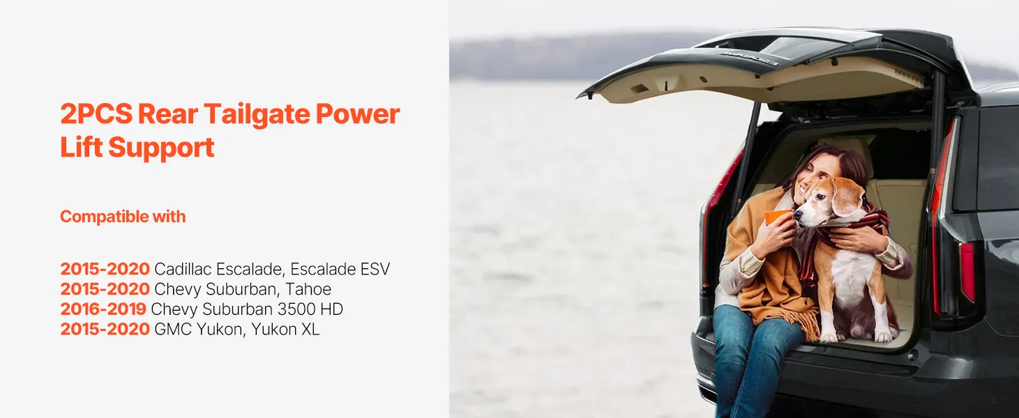 Kompatibilitet med kjøretøy: Denne støtten til baklukeløfteren er kompatibel med Cadillac Escalade/Escalade ESV fra 2015–2020, Chevy Suburban/Tahoe fra 2015–2020, Chevy Suburban 3500 HD fra 2016–2019 og GMC Yukon/Yukon XL fra 2015–2020. Reservedelnummer: 84306929 og 23226162. Bekreft modellen din for nøyaktig passform.