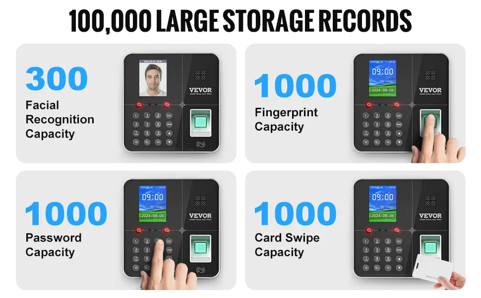 Our biometric time clock can store up to 1,000 fingerprint records, 1,000 password entries, 1,000 RFID card entries, 300 face entries, and 100,000 information records.