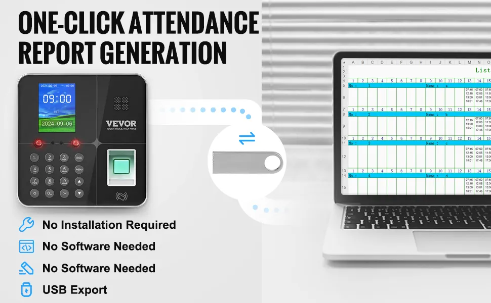 Instant Attendance Reports: This biometric time clock exports attendance records effortlessly with our included USB drive. It can simplify payroll and data processing with detailed attendance logs, ensuring accurate compensation for work hours, including actual work time, total hours, overtime, and lunch breaks—ready-to-submit reports in Excel format for easy computer operation and printing.