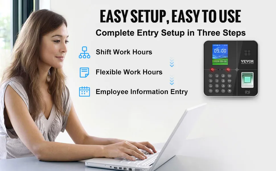 User-Friendly Setup: Meet our clock-in machine, you can skip the complex procedures with our 5-step initial setup: shift configuration, department setup, employee registration, and attendance rules. Then, you're ready to go. Customize work hours, lunch breaks, and overtime to fit various employee schedules.