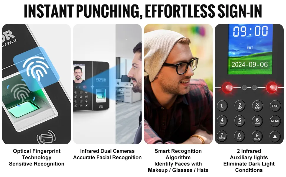 Advanced Verification Technology: This fingerprint time clock has intelligent algorithms and infrared dual cameras to ensure accurate facial recognition, even with makeup, glasses, or hats. Two infrared lights eliminate low-light issues. Optical fingerprint technology provides less than 1 second response time, and a 2.4-inch HD color screen enhances the user experience with support for 5 languages: English, German, French, Spanish, and Italian.