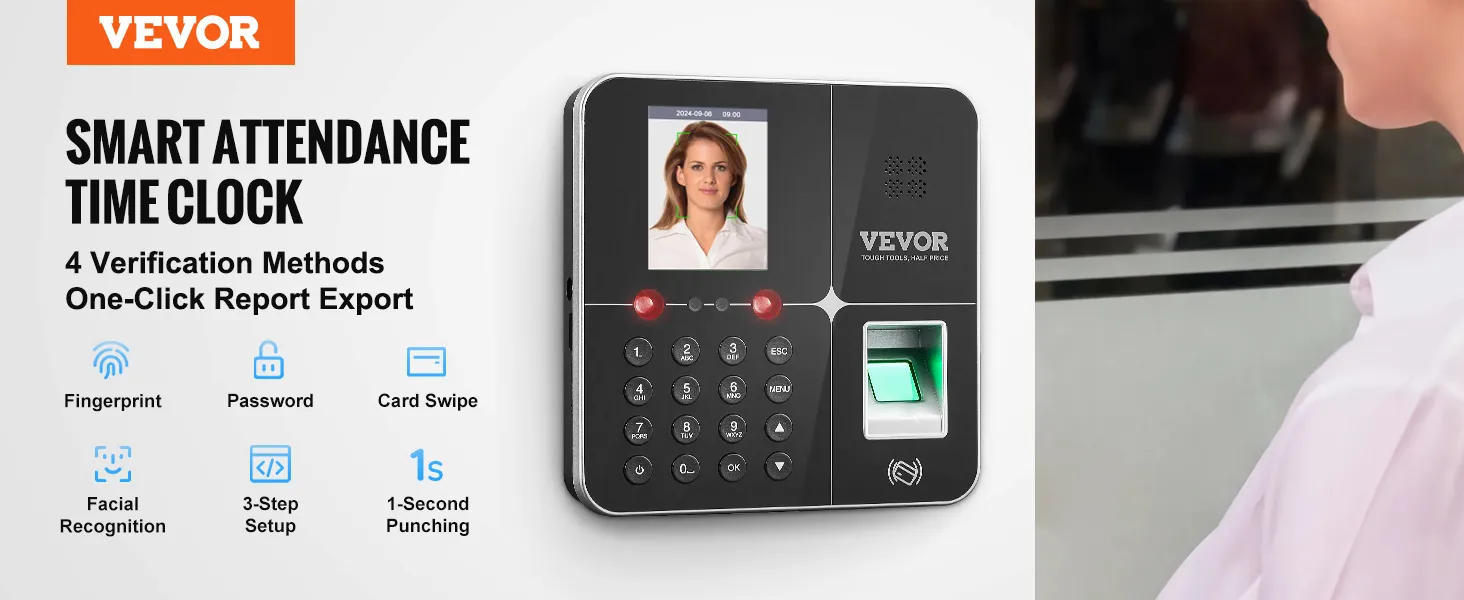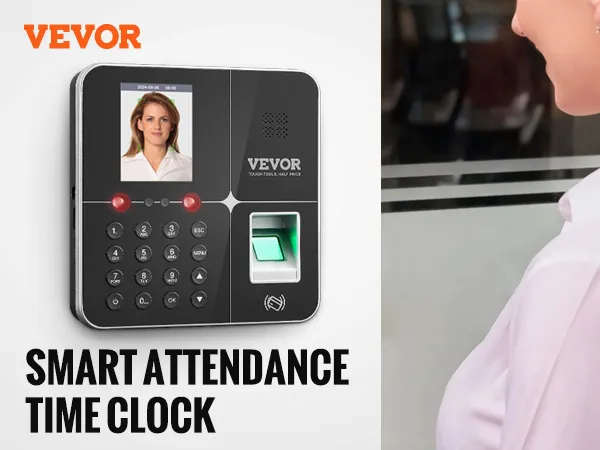 VEVOR-työajanseurantalaite, työntekijöiden läsnäoloon keskittyvä kasvojentunnistus-, sormenjälki-, RFID-kortti- ja PIN-kooditunnistuslaite yhdessä, itsenäinen biometrinen työajanseurantalaite työntekijöille, jossa on 5 RFID-korttia ja ei kuukausimaksuja