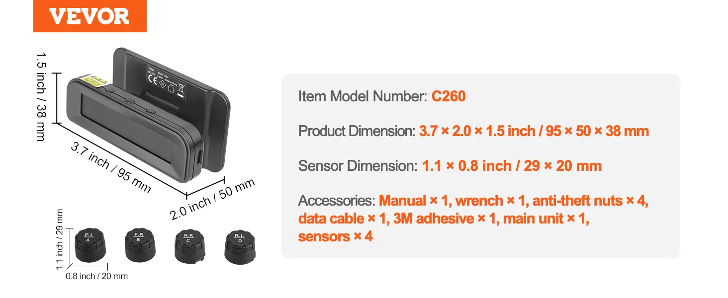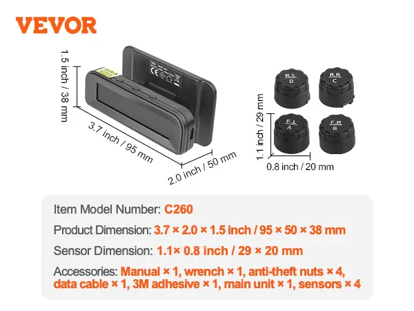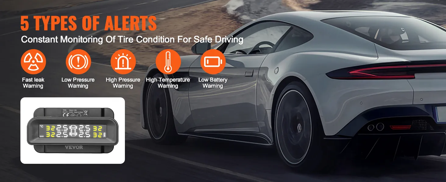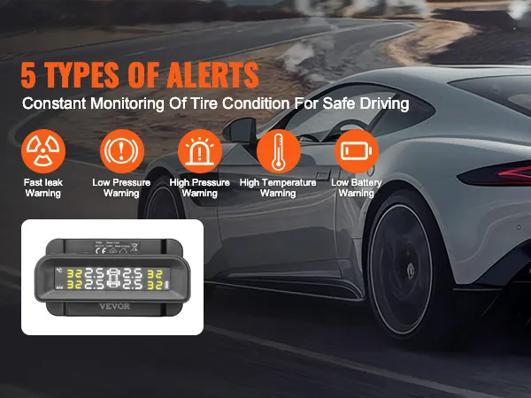 Systém vícenásobných výstrah: Naše sada vodotěsných senzorů TPMS je vybavena pěti typy výstrah před abnormálním tlakem v pneumatikách, včetně varování před rychlým únikem, varování před nízkým/vysokým tlakem, varování před vysokou teplotou a varování před vybitím baterie, které vás informují o stavu pneumatik a pomáhají předcházet potenciálním nebezpečím.