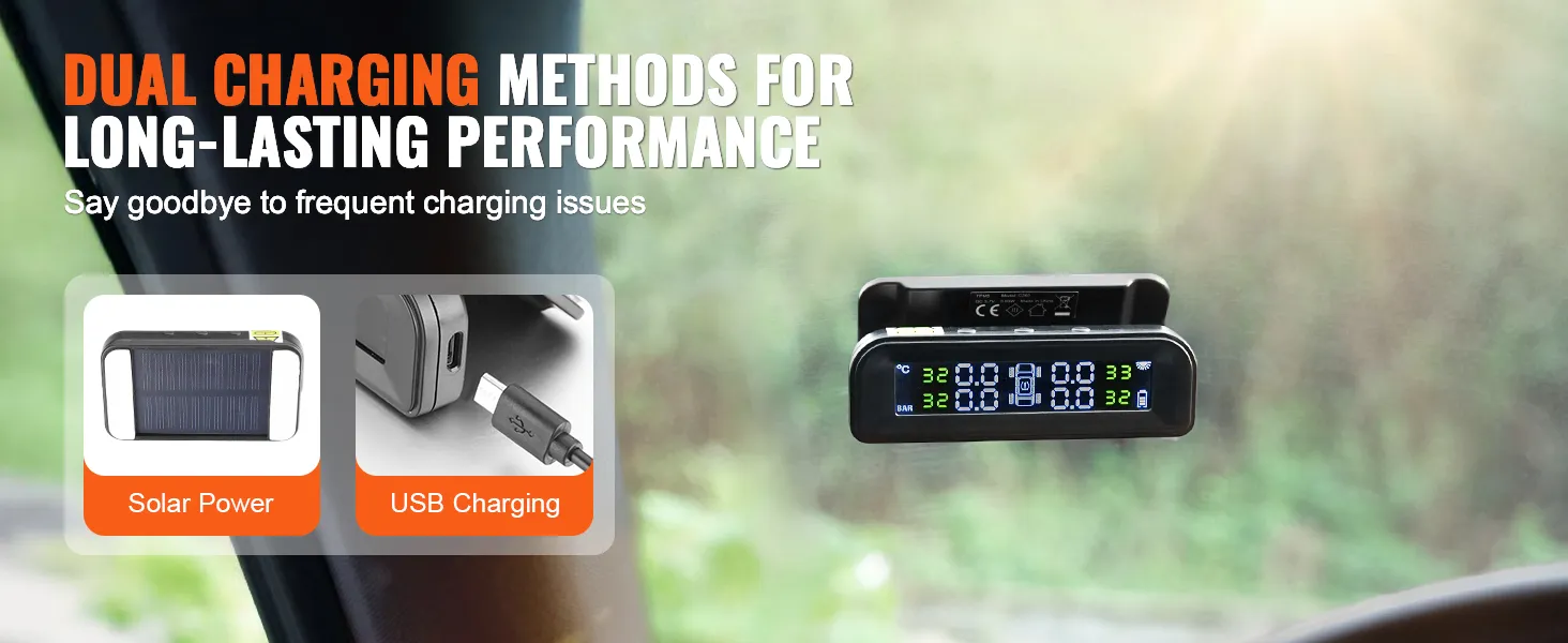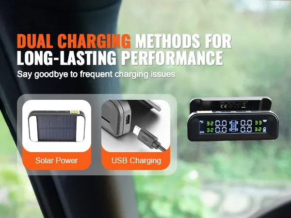 Tento snímač teploty obytného vozu (TPMS) se nabíjí bezdrátově solární energií nebo přes rozhraní USB. V oblačných podmínkách nebo v noci, kdy není dostatek slunečního světla, se můžete spolehnout na nabíjení přes USB pro dlouhodobý výkon.