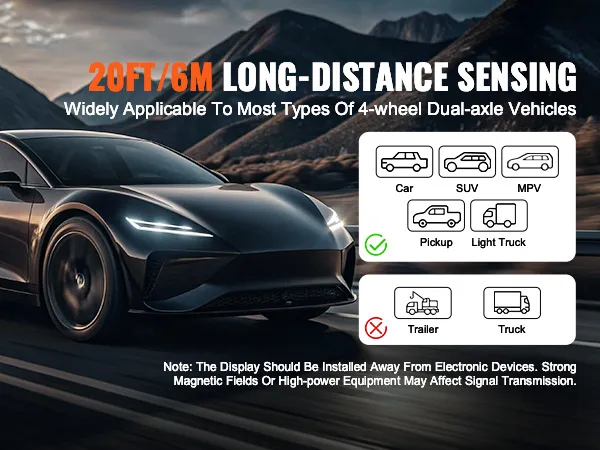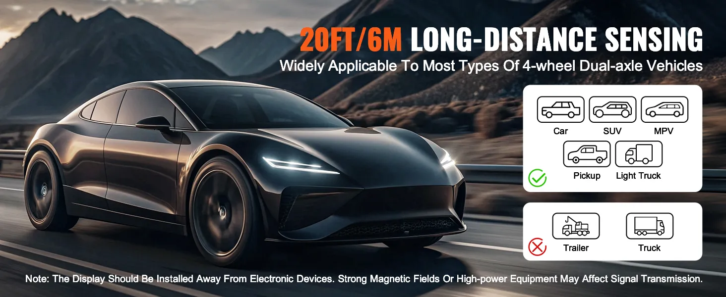 Díky ultra dlouhému přenosovému dosahu je náš univerzální bezdrátový autoalarm vhodný pro automobily, SUV a další vozidla a poskytuje stabilní monitorování a nepřetržité spolehlivé údaje o pneumatikách.