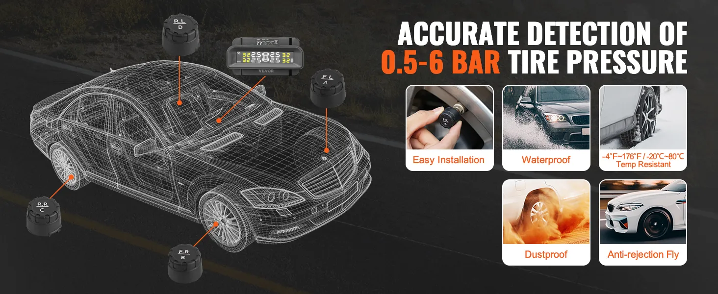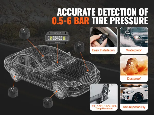 Detekce tlaku v pneumatikách v širokém rozsahu: Tento univerzální systém monitorování tlaku v pneumatikách přesně měří tlak v pneumatikách v rozmezí 7,3–87 psi/0,5–6 barů. Vysoce přesné čipy poskytují přesnost dat +/-0,1 baru. Displej s vysokým rozlišením poskytuje data v reálném čase s jasnými údaji o teplotě i tlaku za jakýchkoli světelných podmínek, ve dne i v noci.