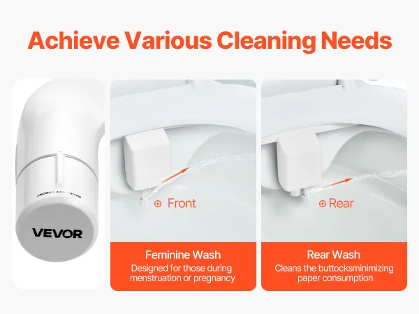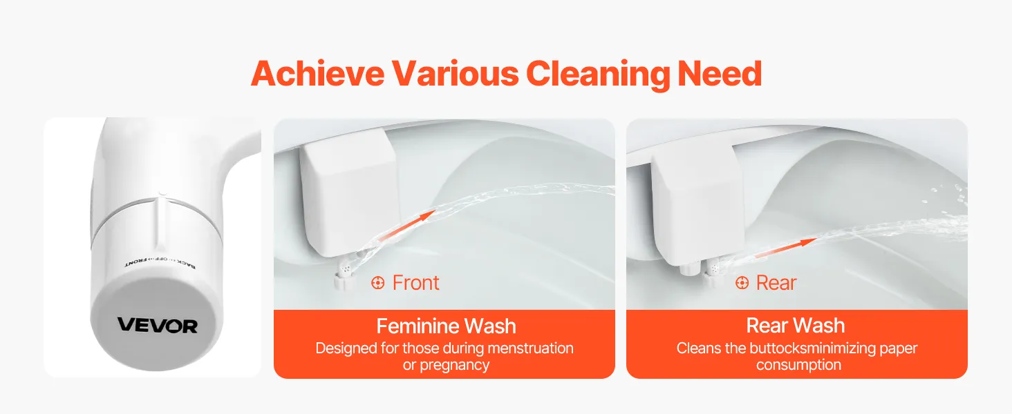 • Dual Cleaning Modes: This dual nozzle bidet attachment offers separate feminine and rear wash functions, designed to meet different cleaning needs, especially gentle care for pregnant users and those during their period.