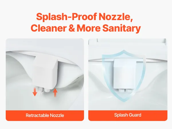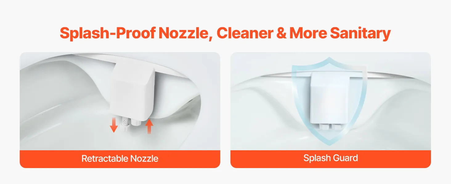 • Retractable Nozzles: This toilet bidet attachment features a retractable nozzle that hides behind a splash guard when not in use, keeping it clean and protected for a cleaner wash every time.