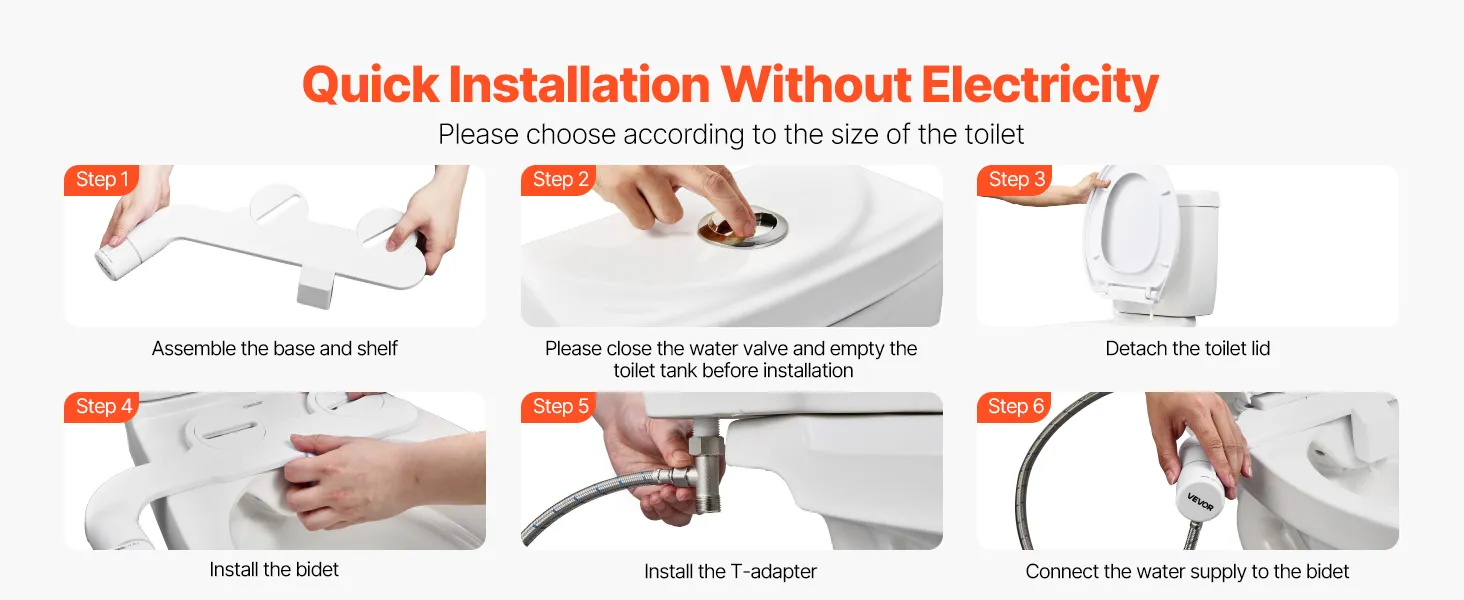 This toilet seat bidet attachment installs easily—no electricity, no special tools, no plumber required. Just measure your toilet before purchase. Tip: Avoid overtightening seat bolts to keep the bidet level.