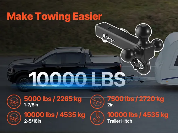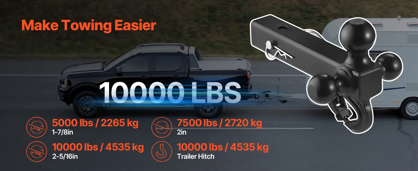 Ťažné zariadenie VEVOR, trojguľový držiak s hákom a čapom, veľkosť gule prívesu 1-7/8", 2" a 2-5/16", vhodné pre 2-palcový prijímač ťažného zariadenia, maximálna nosnosť 10 000 libier, ťažné zariadenie pre obytné vozidlá, SUV, štvorkolky a nákladné vozidlá, čierne