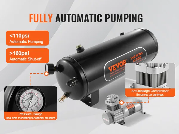 The compressor operates automatically, inflating when tank pressure drops below 110psi and pausing at over 160psi to prevent overpressure. A sensitive pressure gauge monitors the tank, and an upgraded leak-proof structure ensures reliable horn activation with minimal delay or malfunction risks.