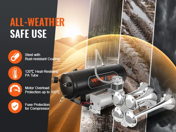Shock Absorption and High-Temperature Resistance: The 4 trumpet train horn kit includes a thick rubber cushion for noise reduction and enhanced stability when installed between the tank and vehicle bottom. The PA gas pipe withstands temperatures up to 120℃, and the motor is equipped with a 100℃ temperature control overload protection, ensuring safe operation in various weather and road conditions.