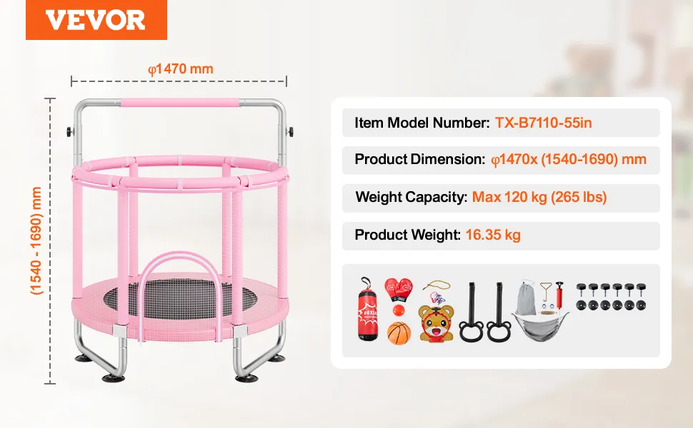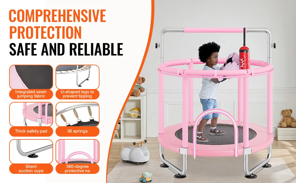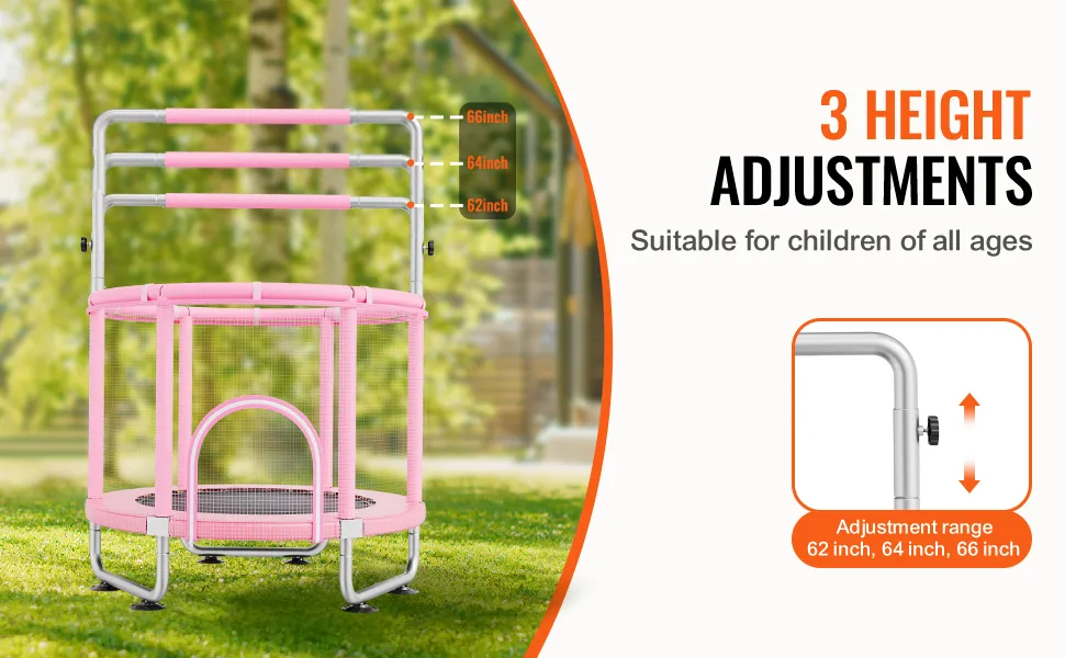 Three height options are available, adjustable from 59 inch, 60 inch, or 62 inch, our mini baby toddler trampoline is suitable for all ages, effectively releasing children's natural energy for the best family activity.