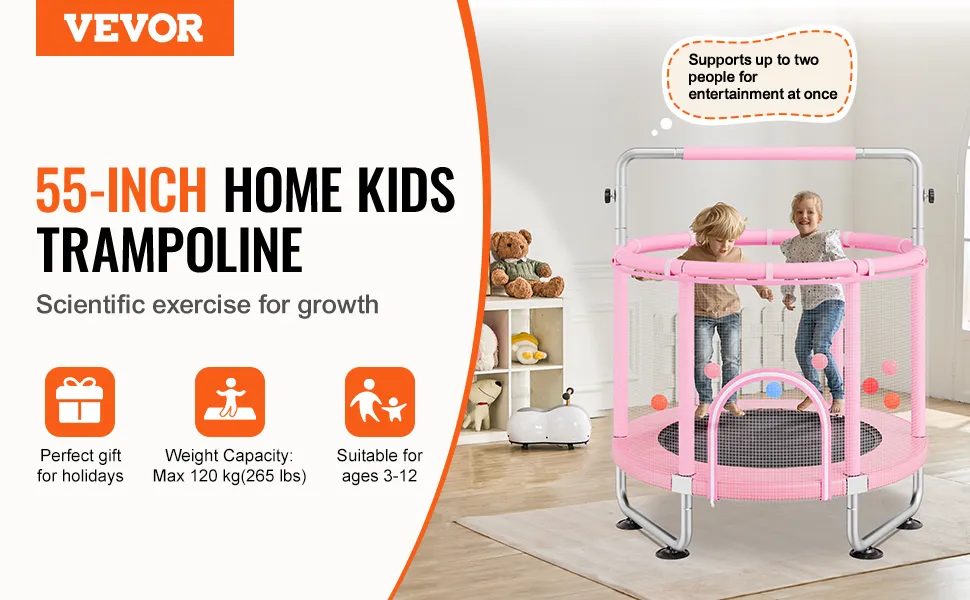 Designed for Kids: Unleash children's natural energy with the best family activity game. The 55-inch kids' trampoline with safety net is designed specifically for children, accommodating two jumpers at once. It provides kids with more exercise at home, enhancing their strength and endurance while promoting fun activities that improve flexibility and coordination.