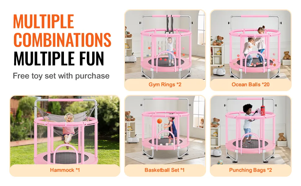 Multiple Fun Options: Our mini baby toddler trampoline is suitable for both indoor and outdoor use, with sizes that fit perfectly. The trampoline accessories include rings, swings, sandbags, ocean balls, and a basketball set, providing your child with more fun while jumping. It's the top choice for holiday gifts for kids.