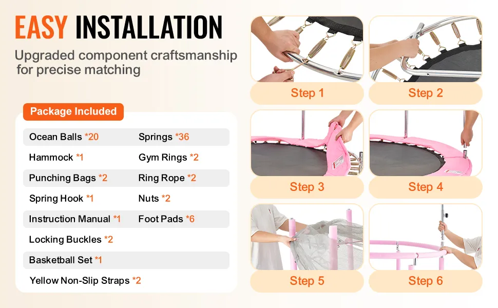 Only one adult is needed to assemble the baby toddler trampoline. Follow the instructions to assemble the frame, tighten the legs, and attach the mat to the jumping frame. The installation holes and threads are precisely matched for a one-step installation.
