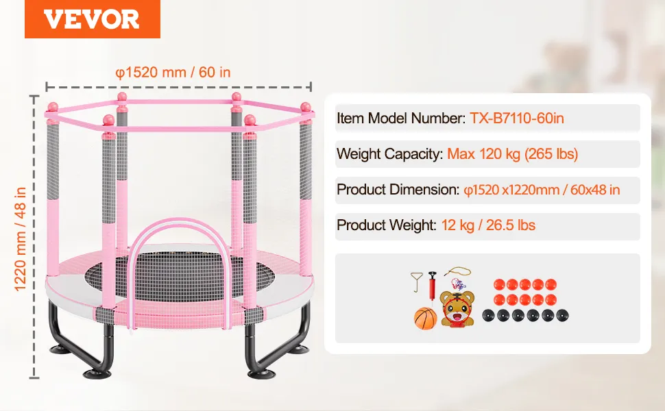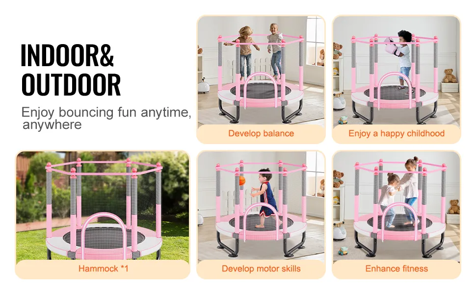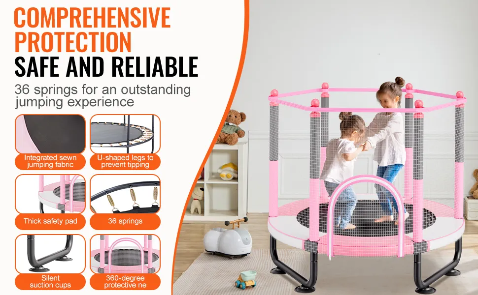Større og bredere børnetrampolin: Den 60-tommer børnetrampolin tilbyder et større hoppeområde, der nemt giver børn mulighed for at slippe deres naturlige energi løs, hvilket gør den til det bedste familieaktivitetsspil. Den kan rumme to hoppere på én gang, hvilket giver børn mere motion derhjemme, forbedrer deres styrke og udholdenhed, samtidig med at den fremmer sjove aktiviteter, der forbedrer fleksibilitet og koordination.
