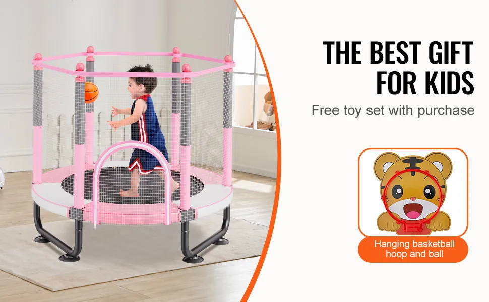 Vores mini-babytrampolin til småbørn inkluderer tilbehør som en hængende basketballkurv og bold, der giver mulighed for basketball og hoppesjov overalt, uanset om det er indendørs, udendørs, i haven eller baghaven.