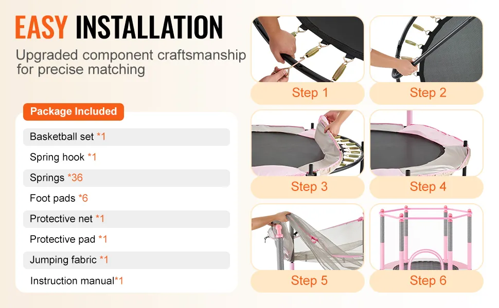 Kun én voksen skal samle baby- og småbørnstrampolinen. Følg instruktionerne for at samle stellet, stramme benene og fastgøre måtten til hopperammen. Installationshullerne og gevindene er præcist matchet for en installation i ét trin.