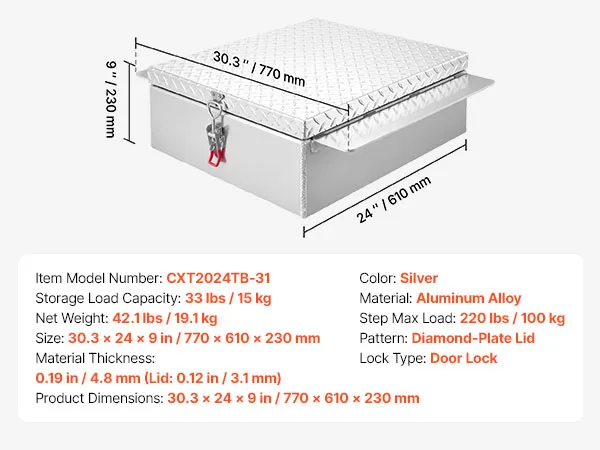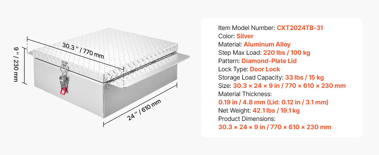 Strong Load-Bearing: Constructed from 0.12-0.19 in / 3.1 mm-4.8 mm metal panels with a diamond tread to enhance strength, the step platform can support up to 220 lbs / 100 kg. The truck tool box handles heavy load of tools, providing stable storage solution