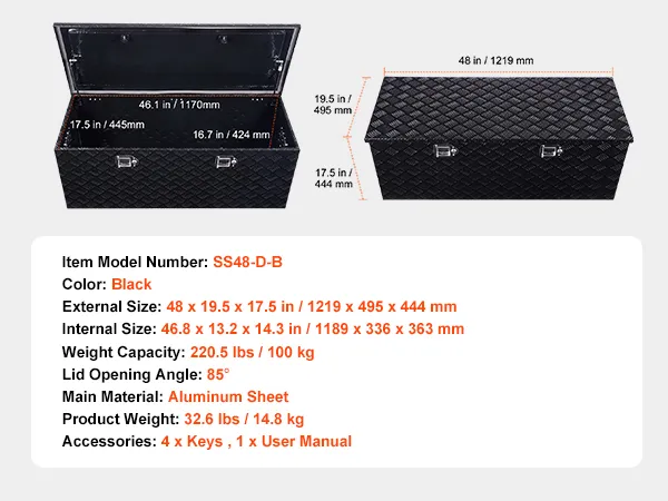 VEVOR Heavy Duty Aluminum Truck Bed Tool Box, Stripes Plated Tool Box with Side Handle and Locks Keys, Storage Toolbox Chest Organizer for Trailer, Pickup, 48"x19.5"x17.5"(1219.2x495.3x444.5mm), Black
