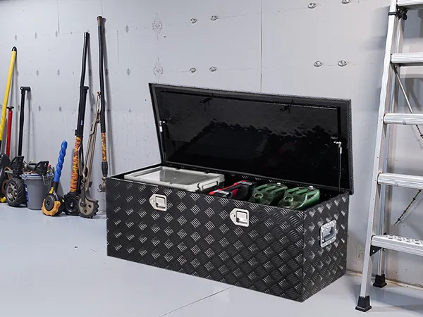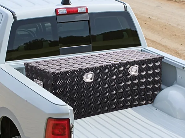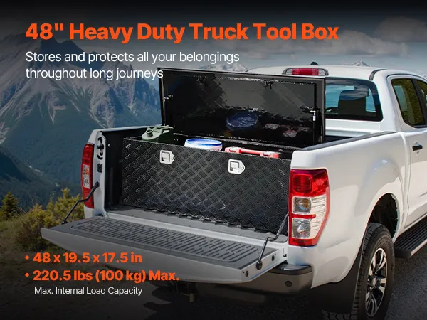 Durable Aluminum Construction: The truck tool box is made from lightweight, sturdy high-quality aluminum sheet. Its surface features a stripe tread pattern and powder coating, offering excellent rust resistance to withstand extreme weather conditions like heavy rain, coastal salt mist, and winter snowmelt. The packaging protects the corners to prevent deformation during transport