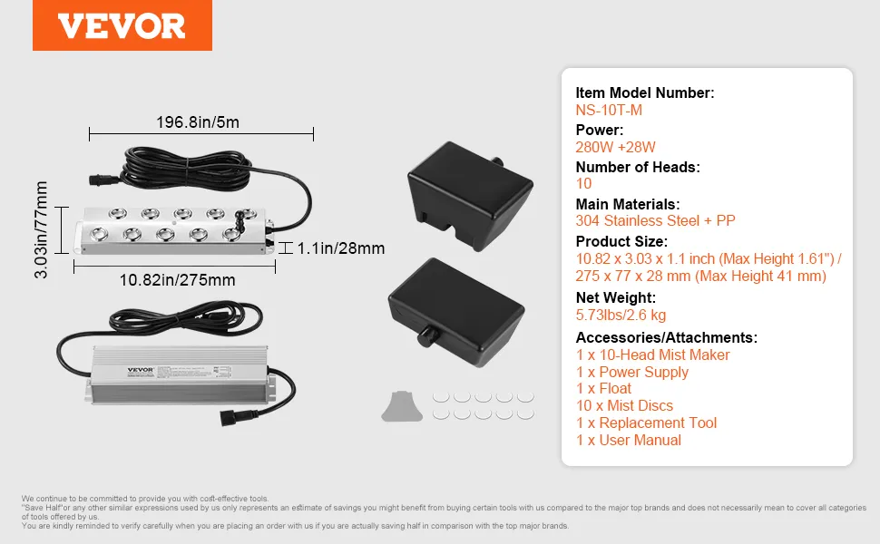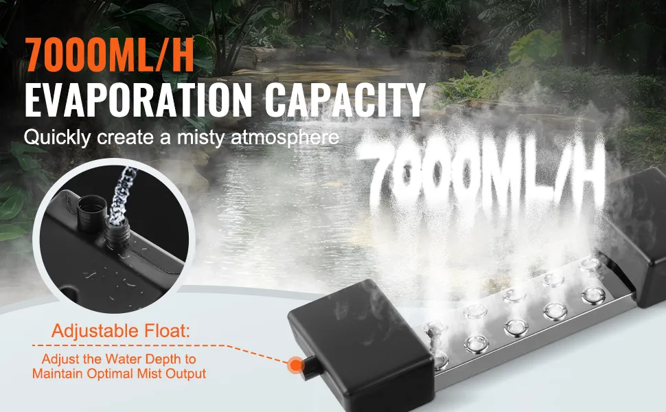 VEVOR Nebulizador Ultrassônico com 10 Cabeças, Nebulizador Ultrassônico de 7000 mL/H, Nebulizador com Fonte de Alimentação à Prova D'água IP67 de 280 W, Boia, Discos de Reposição, para Lagoa, Jardim, Jardim de Pedra, Estufa, Decoração de Halloween
