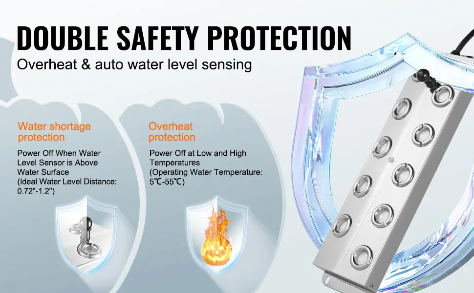 Seguro e confiável: O nível ideal de água para instalação é 2 cm acima do sensor. Quando o sensor detecta que o nível da água está abaixo do limite de segurança, ele corta automaticamente a energia. O nebulizador ultrassônico também inclui um sensor de temperatura da água que desliga automaticamente o fornecimento de energia em temperaturas baixas ou altas (temperatura da água de trabalho: 5°C-55°C) para evitar danos por queima a seco.
