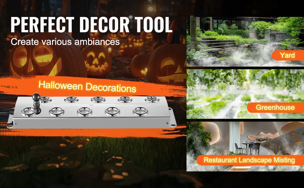 Ideal para embelezar jardins, otimizar estufas e nebulizar paisagens de restaurantes, nosso nebulizador de lagos também se destaca na criação de atmosferas festivas para o Halloween e outros feriados. Adapta-se a diversos ambientes para proporcionar uma experiência excepcional com o produto.