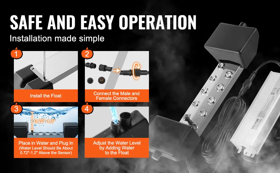O nebulizador ultrassônico para lagos é fácil de instalar, com um processo claro de 4 etapas. Basta colocar o nebulizador na água com a parte frontal voltada para cima, conectar à tomada e ele gerará uma grande quantidade de névoa, economizando tempo e esforço valiosos.