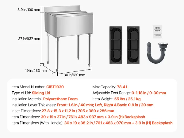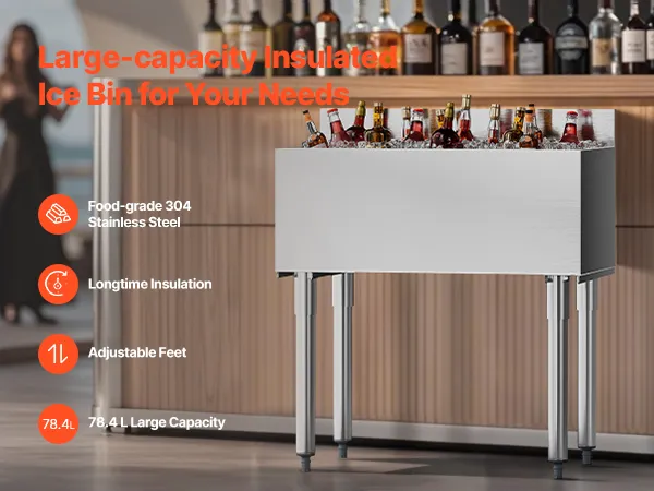 Με μεγάλη χωρητικότητα 78,4 λίτρων, ο επαγγελματικός μας κάδος πάγου συνδυάζει ανώτερη μόνωση με βολική λειτουργικότητα. Κατασκευασμένος από ανοξείδωτο ατσάλι 304 κατάλληλο για τρόφιμα, εξασφαλίζει ότι ο πάγος παραμένει κατεψυγμένος για έως και 24 ώρες. Εξοπλισμένος με ρυθμιζόμενα πόδια, προσαρμόζεται σε διάφορες επιφάνειες, ιδανικός για ευέλικτη χρήση.