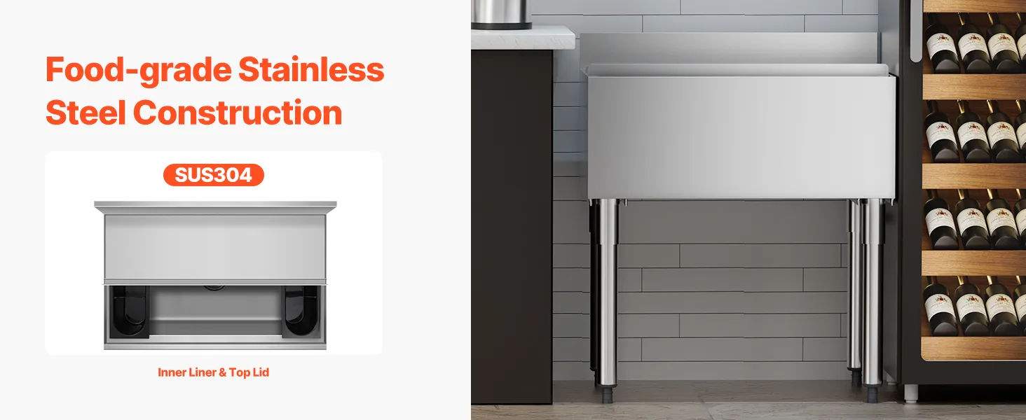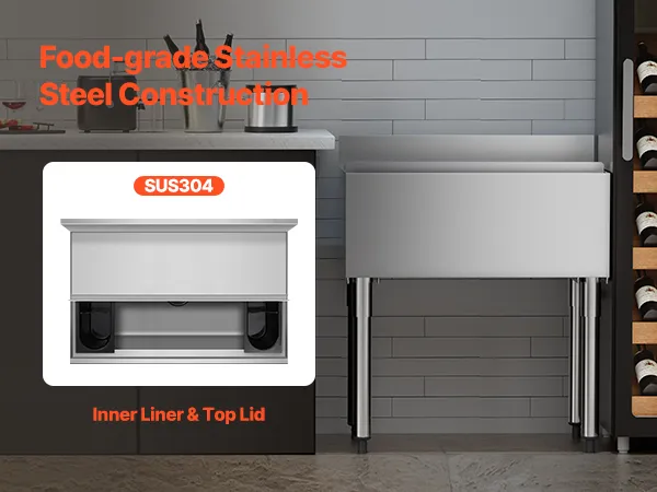 Ο κάδος πάγου κάτω από το ράφι μας είναι κατασκευασμένος από ανοξείδωτο ατσάλι 304, κατάλληλο για τρόφιμα. Η εσωτερική επένδυση και το καπάκι του είναι κατασκευασμένα από ανοξείδωτο ατσάλι 304, κατάλληλο για τρόφιμα, για ανθεκτικότητα και ασφάλεια. Πιστοποιημένο από τον NSF για την ηρεμία σας.