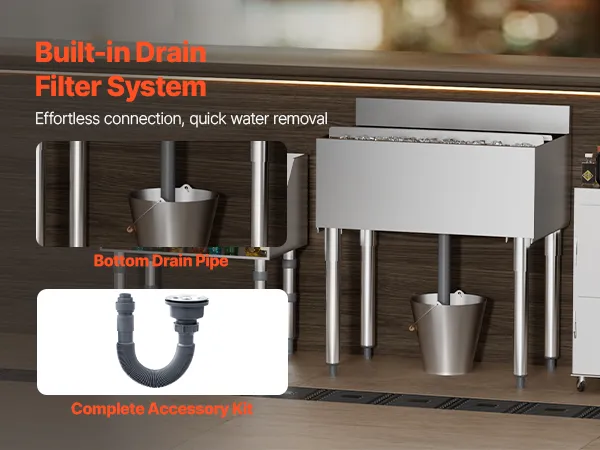 Ανθεκτικό στη σκόνη και στα πιτσιλίσματα πίσω μέρος: Με πάχος 100 mm, το πίσω μέρος του επαγγελματικού μας κάδου πάγου κάτω από το ράφι παρέχει απαραίτητη προστασία, εμποδίζοντας τη σκόνη και τα πιτσιλίσματα να φτάσουν στους τοίχους και τα πατώματά σας και διατηρώντας τα πάντα καθαρά και στεγνά.