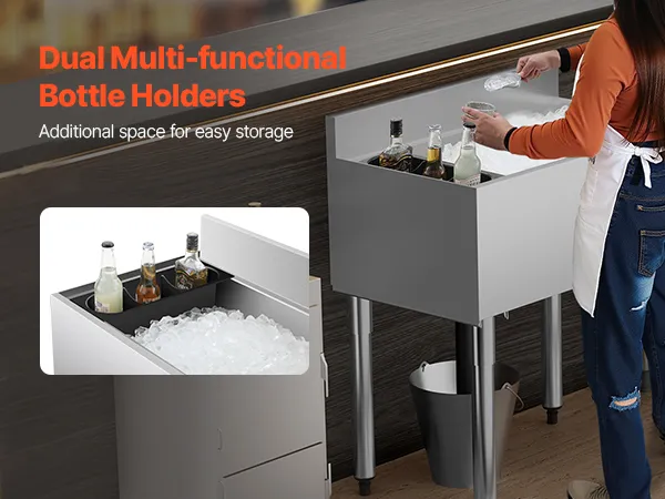 Ο επαγγελματικός μας κάδος πάγου κάτω από το μπαρ διαθέτει δύο θήκες για μπουκάλια, καθεμία από τις οποίες χωράει τρία μπουκάλια. Λύνει το πρόβλημα αποθήκευσης για συχνά χρησιμοποιούμενα μίξερ ή ποτά, απλοποιώντας τη διαδικασία αποθήκευσης και παρέχοντας επιπλέον χώρο.