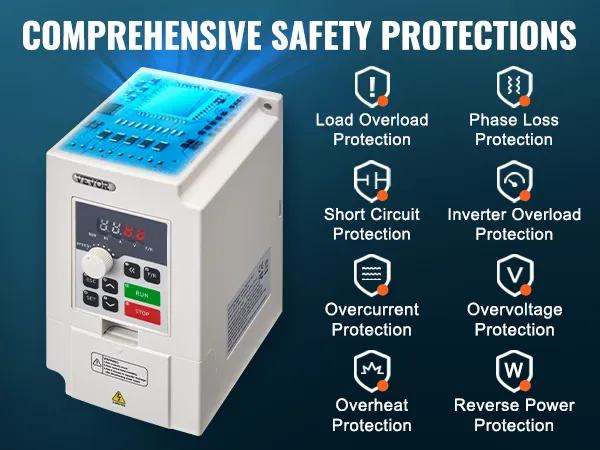 Náš frekvenční měnič je vybaven inteligentním ochranným systémem, který poskytuje ochranu proti nadproudu, přetížení, přepětí a výpadku fáze. Je vyroben převážně z nehořlavého plastu, což zajišťuje vysoký výkon a kvalitu zevnitř i zvenku.