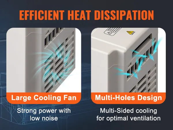 Efektivní odvod tepla: Tento frekvenční měnič je vybaven výkonným chladicím ventilátorem a víceotvorovou konstrukcí, což zajišťuje efektivní odvod tepla a vylepšené větrání. Poskytuje stabilní a dlouhotrvající výkon se sníženou hlučností, což z něj činí ideální volbu pro náročné průmyslové aplikace.