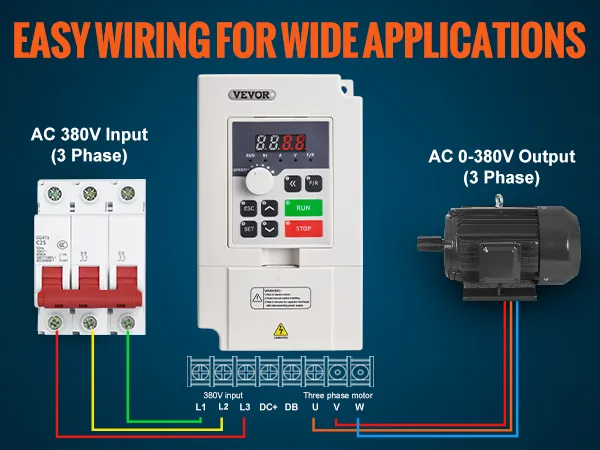 Vstup frekvenčního měniče je třífázový střídavý proud 380 V a výstup je třífázový střídavý proud 0 ~ 380 V, vstupní frekvence je 50/60 Hz a výstupní frekvence je 0–2000 Hz. Díky snadnému zapojení, intuitivnímu displeji a komplexním ochranám zjednodušuje provoz a zvyšuje energetickou účinnost.