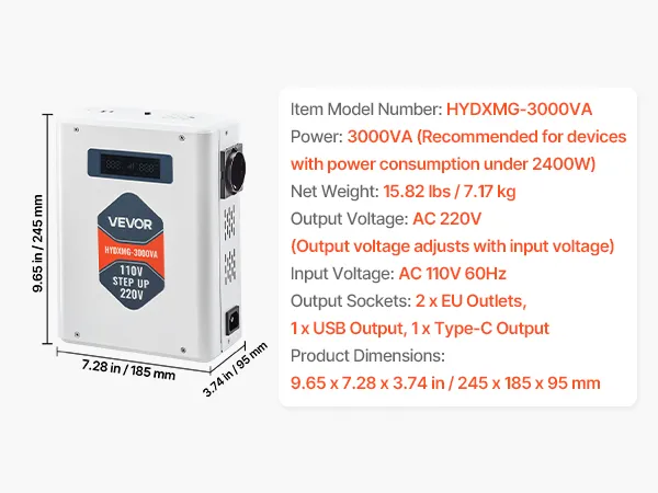 3000VA Step Up Voltage Converter: Delivers up to 3000VA with 80% max load. With two standard EU output sockets, 1 USB output, and 1 Type-C output, this voltage converter transformer powers multiple appliances at once