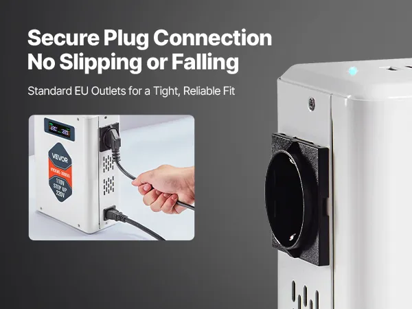Q: What are the benefits of a standard outlet socket? A: Our voltage converters come with standard EU output sockets for the Step-Up model or US output sockets for the Step-Down model. This standard design ensures a secure connection with your devices, and accommodates various electronic devices.