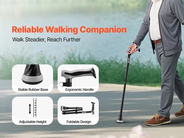 Naše hůl na chůzi poskytuje výjimečnou stabilitu pro každodenní potřeby mobility s protiskluzovou TPR pryžovou špičkou, 8stupňovým nastavením výšky, skládacím designem a nosností 113 kg. Její ergonomický design snižuje namáhání paží a umožňuje vám chůzi s lehkostí a jistotou – ideální pro osoby s omezenou pohyblivostí.