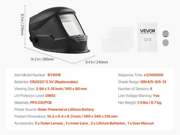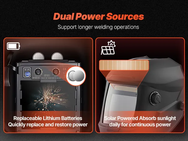 Solar-Powered: This auto-darkening welding helmet features 2 lithium batteries and supports solar charging, eliminating the need for frequent battery replacements. The stable power supply ensures consistent, long-lasting performance