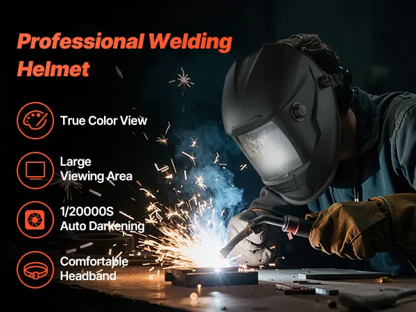 VEVOR auto-darkening welding helmet features a DIN 4/5–9/9–13 wide shade range, true color tech, and 4 arc sensors, delivering a clearer, more natural viewing experience. It efficiently filters harmful light, reduces eye fatigue, and ensures safer grinding, welding, and cutting operations.