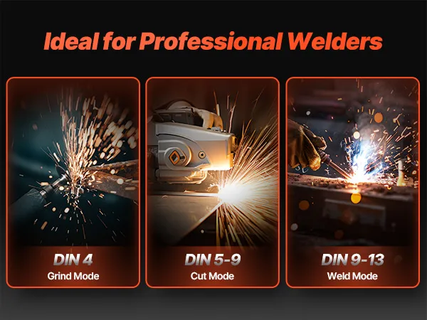 Wide Shade Range: Our true color welding mask features adjustable DIN shade levels—DIN 4 (Grind Mode), DIN 5–9 (Cut Mode), and DIN 9–13 (Weld Mode). Easily switch between working modes to enhance efficiency and safety