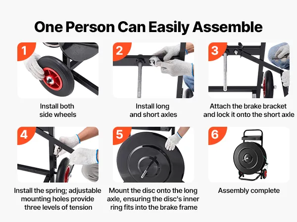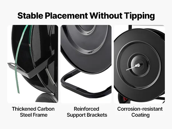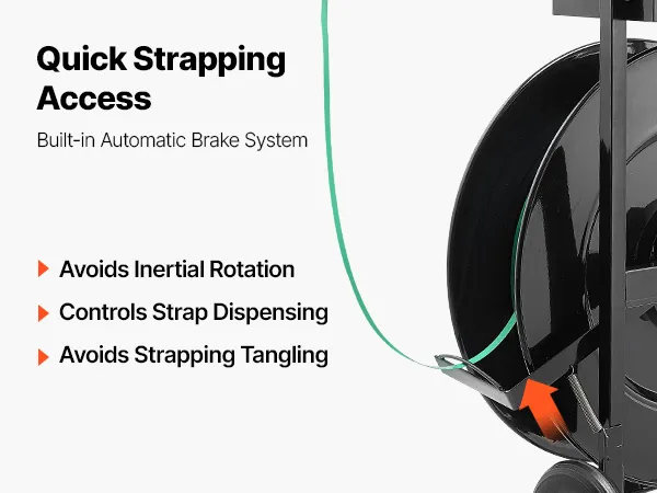Built-in Auto Brake: The auto brake of the steel strapping dispenser avoids over-rotation, stopping excess strap from unspooling. It maintains tension stability, avoiding tangling, and allows easy spring tension adjustments for seamless use
