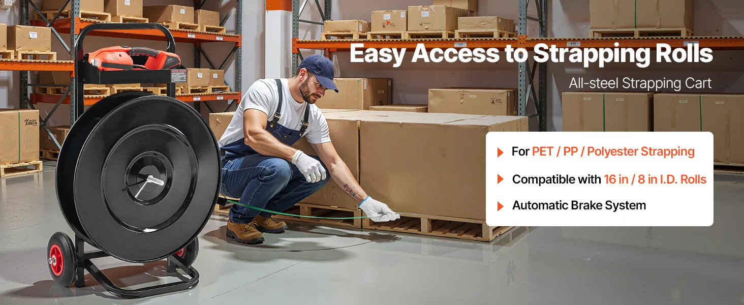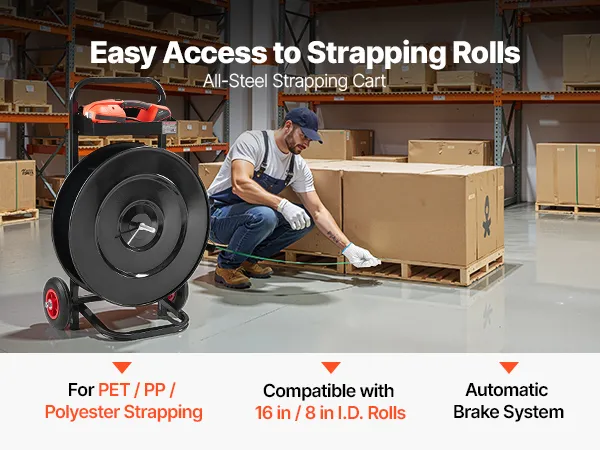 Vhodné pro různé velikosti pásek: Tento celoocelový páskovací vozík unese až 45 kg a pojme role PET/PP/polyesteru s jádrem o průměru 43 cm/20 cm. Udržujte své pásky úhledné a připravené, což zvyšuje efektivitu při náročné práci.
