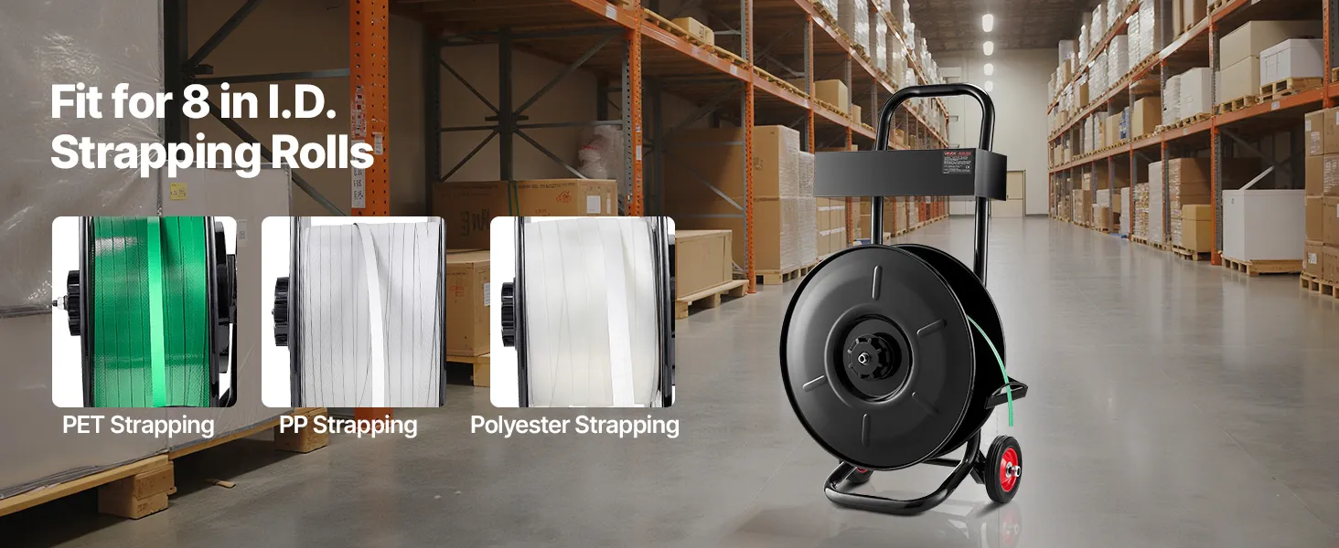 Fits Multiple Strap Sizes: This all-steel strapping cart holds up to 110 lbs and fits 8 in core PET/PP/polyester rolls. Keep your straps neat and ready, increasing efficiency for heavy-duty work