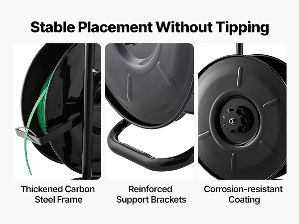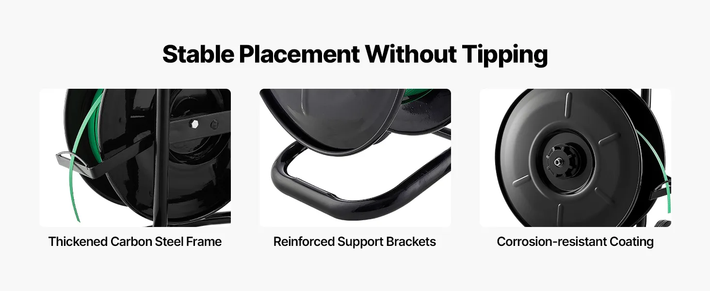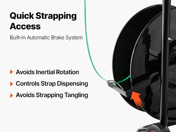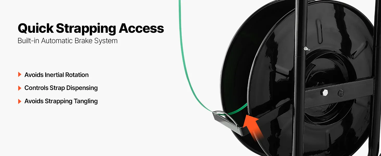 Built-in Auto Brake: The auto brake of the steel strapping dispenser avoids over-rotation, stopping excess strap from unspooling. It maintains tension stability, avoiding tangling, and allows easy spring tension adjustments for seamless use