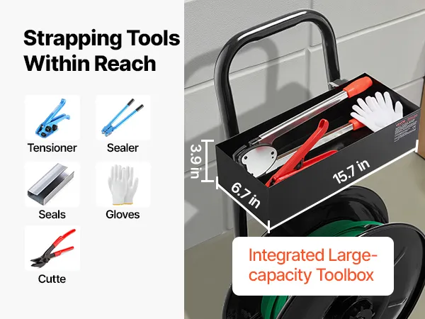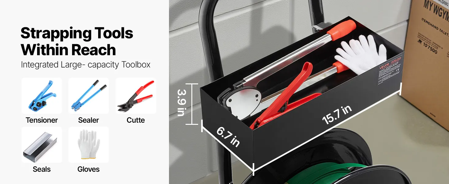 Convenient Tool Storage: Keep your strapping tools close by with a built-in toolbox. Greatly store your tensioners, cutters, and seals for easy access—no more time wasted searching