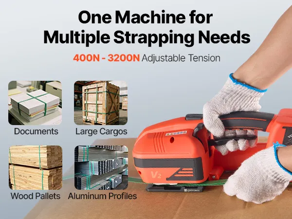 Heavy-duty Strapping: This electric strapping machine delivers up to 3200N tension, easily securing pallets, stone, or steel rolls. With 10 adjustable levels (400–3200N), it also handles boxes, wood, and packages with ease