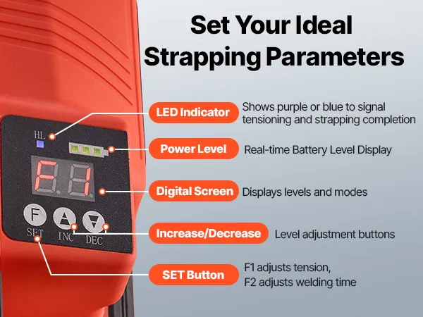 Clear digital display with three buttons for quick adjustment of tension and welding time, making strapping easy